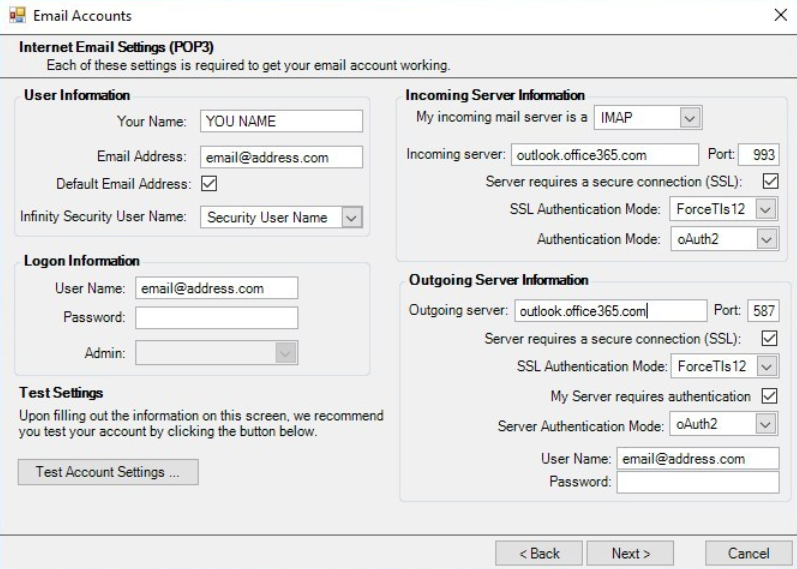 Microsoft will be changing the authentication for Outlook emails, including O365, to use OAuth 2.0. OAuth 2.0 provides more secure access to your email from a third-party program like Infinity.
